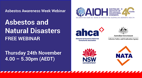 Join us this Thursday, the 24th of November, for a free webinar on Asbestos and Natural Disasters. This webinar focusses on the experiences and lessons learnt from fires and floods in the management of asbestos to prevent exposures to workers and the communities caught up in the clean-ups. Our presenters have been on the front line dealing with the challenges of asbestos exposures during these tragic events.